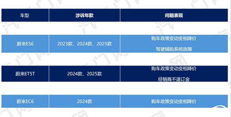 从涉诉车型的具体投诉问题来看,蔚来汽车旗下的主力车型都集中出现了共性问题。蔚来ES6、蔚来ET5T、蔚来EC6均存在购车政策变动变相降价的问题。2025年,上述三款车型的购车政策多次大幅调整,被不少车主视为变相降价,损害老用户权益。该问题集中在6月“优选车”选配大降价、7月权益升级、8月全系标配100kWh电池三波政策变动,引发车主广泛不满。此外,蔚来ES6因驾驶辅助系统故障遭到车主投诉。
