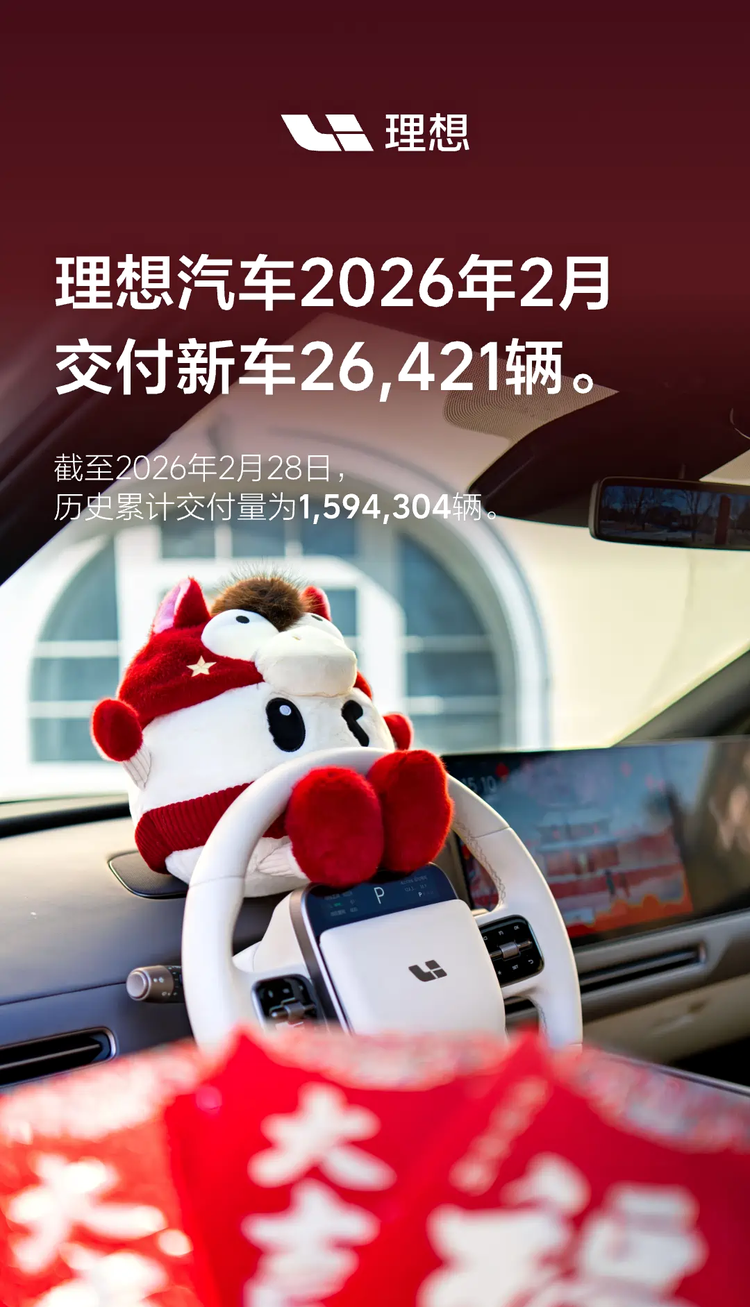车家号·0浏览·2026-03-01 11:56 · 广东3月1日,理想汽车公布了2026年2月的交付数据:当月共交付新车26,421辆,截至2月底,历史累计交付量已达1,594,304辆。在春节长假导致车市整体遇冷的背景下,这份成绩单既有挑战,也透露出品牌的市场韧性。