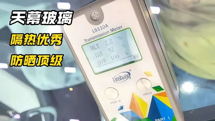 乐道L60 2025款天幕玻璃是全车最防晒最隔热的一块车窗,透光率(VLT)为2.2%,红外阻隔率(IRR)92%,紫外阻隔率(UVR)也为100%。就算没有遮阳帘,这块玻璃也足以保证车内的人在夏天不会被晒黑。但是不得不说,92%的红外阻隔率,对于天幕玻璃来说的确是低了一些……