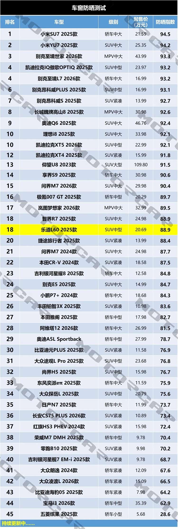 按照测试模型计算下来,乐道L60 2025款全车防晒指数为88.9分,在目前的测试排名中与智界R7暂时并列排名第18,在市面上属于中上水准。