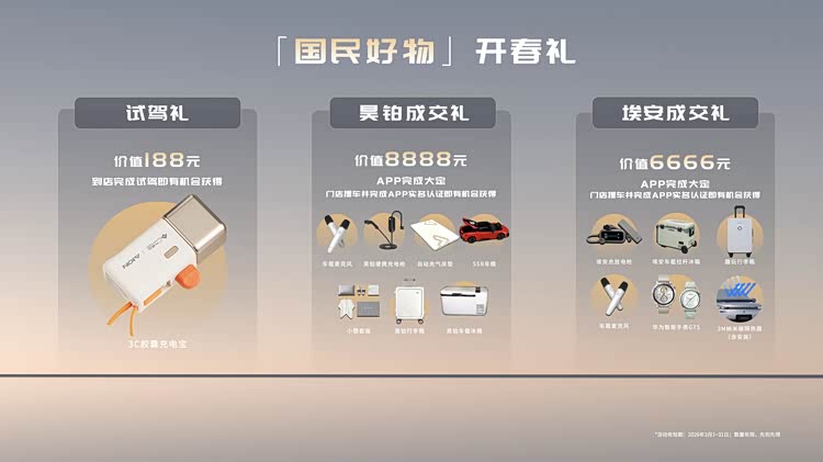 三大国民IP的落地,背后是埃安以用户为中心的战略转型。在广汽集团 “番禺行动” 引领下,昊铂埃安BU全面落地IPD、IPMS体系,实现从 “以产定销” 到 “用户需求驱动创新” 的转变,而连续两年蝉联卡思调查客户满意度第一的成绩,正是其用户思维的最好印证。为让生态价值触达更多用户,埃安还推出3月购车政策,试驾即享188元国民好物礼,下定可获最高8888元成交礼包,将品牌升维与市场增长实现双向赋能。