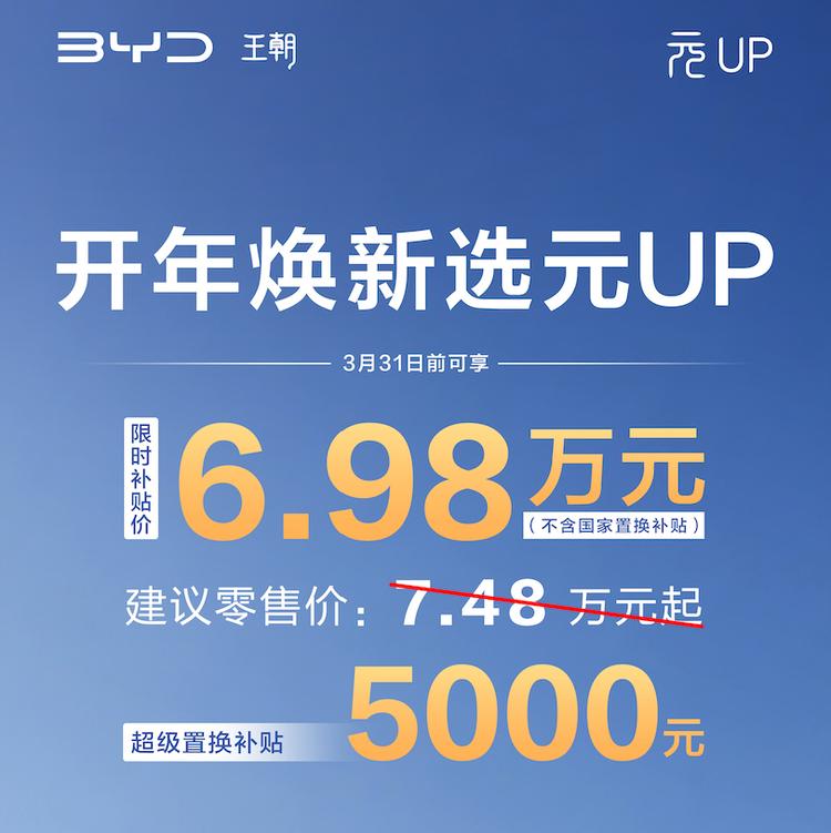 车家号·0浏览·2026-03-01 13:31 · 广东2 月 28 日,我们从比亚迪王朝网销售事业部总经理路天社交媒体处获悉,元 UP 推出限时优惠活动。在 3 月 31 日前可享超级置换补贴 5000 元,综合补贴后 6.98 万元起。