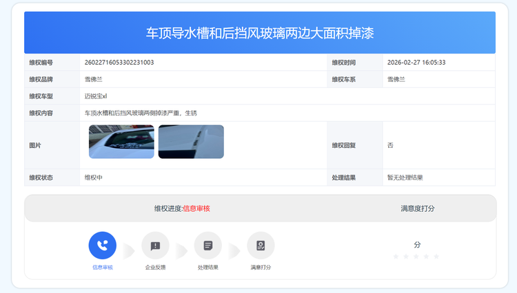 迈锐宝XL车顶导水槽、后挡风玻璃大面积掉漆!车主:希望尽快解决
