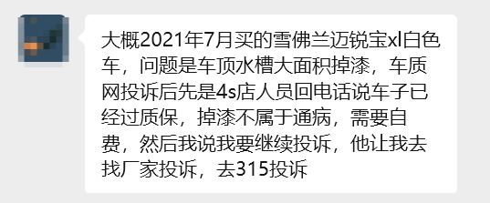该车主于 2021 年 7 月购入 21 款雪佛兰迈锐宝 XL 白色车型,近期发现车辆车顶水槽出现大面积掉漆情况,车主表示该问题为车型通病。发现问题后车主进行投诉,随后接到 4S 店工作人员回电,对方表示车辆已过质保期,且掉漆问题不属于车型通病,相关维修需要车主自费承担。车主提出将继续投诉后,4S 店工作人员竟让车主自行向厂家以及 315 进行投诉。