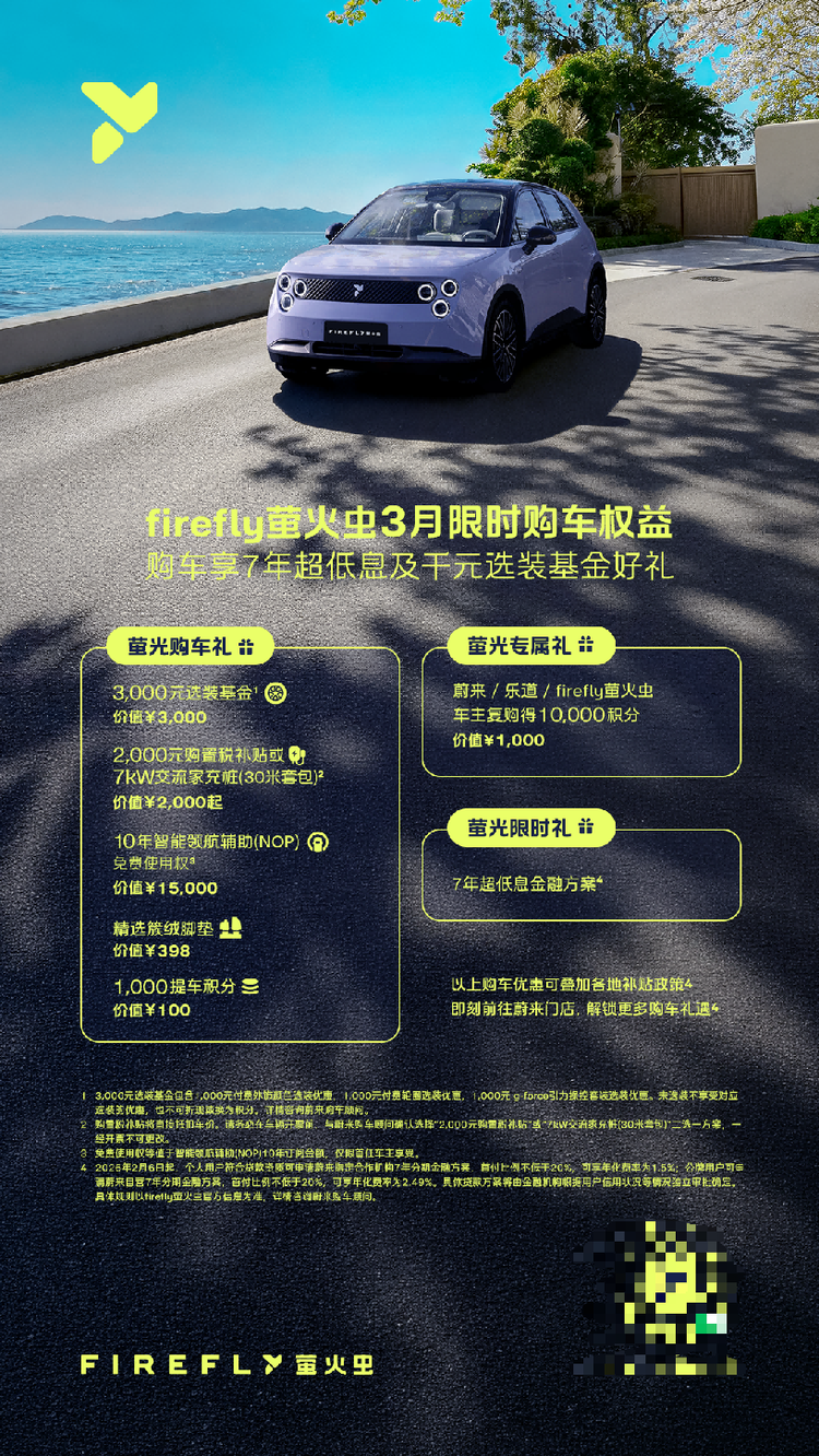 机遇不等人,福利不缺位。firefly萤火虫3月限时购车权益已正式上线,一杯奶茶钱的日常开销,就能解锁全球最安全的智能出行体验,此刻入手,恰逢其时!