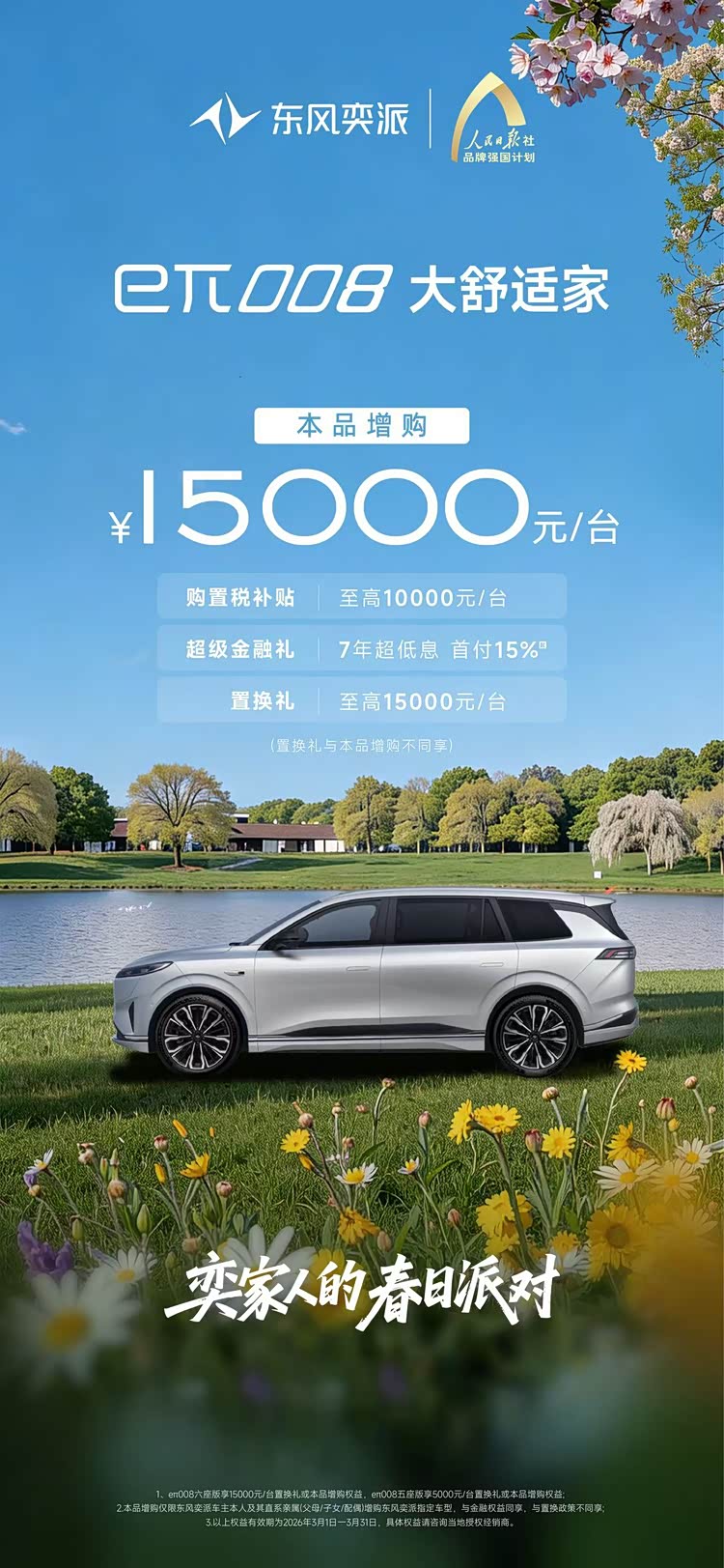 奕派008作为东风奕派专为多孩家庭打造的大家庭智能座驾,以“真满配、真智能、真超值”的全能实力,精准适配不同家庭出行场景。超5米车长、3米轴距的旗舰尺寸,提供纯电及增程两种动力选择,充分满足消费者“既要又要还要更要”的家庭出行高要求。现在购买奕派008,可尊享至高10000元购置税补贴、至高15000元置换补贴以及7年超低息、首付15%等金融方案,轻松开启美好的新春出行生活。