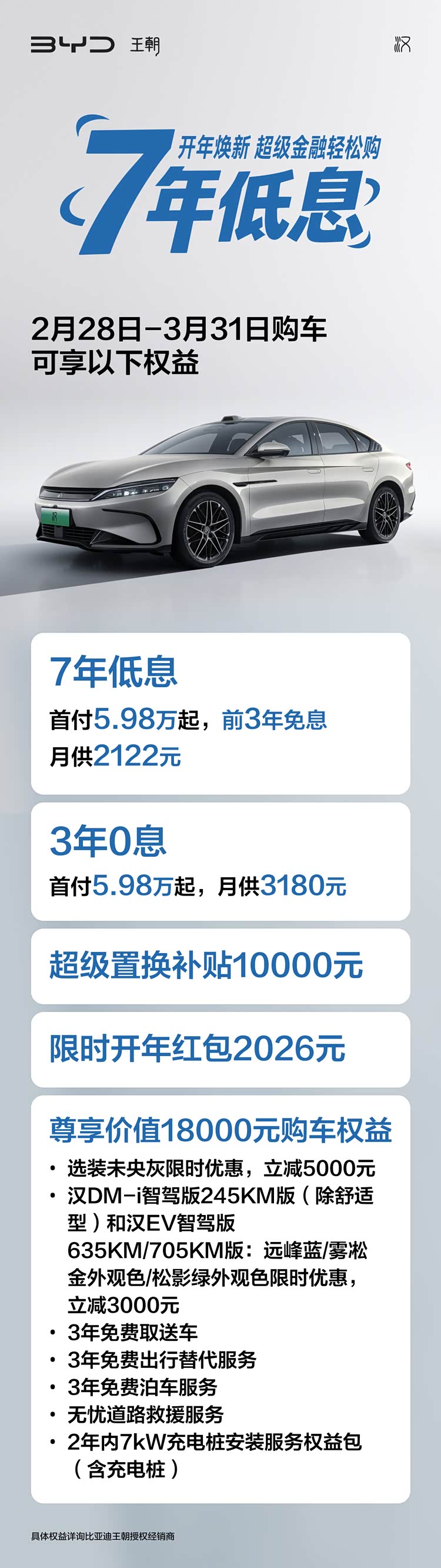 作为20万级主流中高端轿车市场的标杆车型,汉家族累计销量已超110万辆!从全新销量里程碑再出发,比亚迪汉智驾版以诚意满格的金融方案与硬核产品实力,重新定义中高端轿车的价值标杆。开年焕新选王朝,超级金融轻松购,诚邀各位莅临比亚迪王朝网各授权经销店,看车试驾。具体优惠详情,可详细咨询比亚迪王朝网当地经销商。