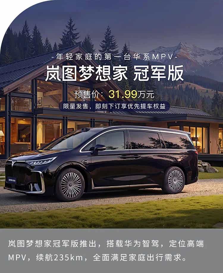 岚图梦想家冠军版,定位“新时代家庭智慧旗舰MPV”,全面满足年轻家庭对MPV科技感、操控灵活、舒适大空间需求,搭载华为乾崑智驾ADS4和鸿蒙座舱5,拥有百万级底盘和智能四驱,是岚图汽车与华为引望深化战略合作后的又一重磅成果,将开启30万级智能家用MPV新时代。