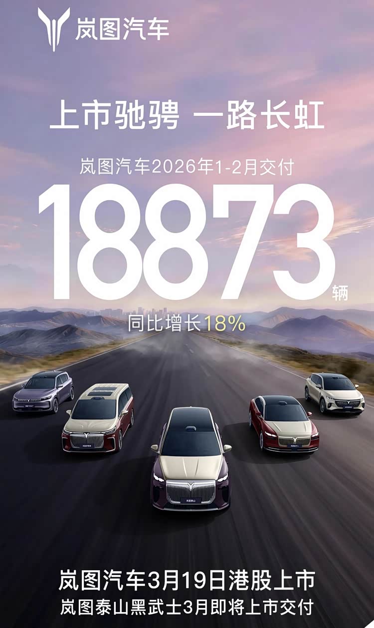 岚图汽车公布了1-2月的累计数据。数据显示,岚图汽车累计交付新车18873辆,同比增长18%。这也就是说,岚图汽车2月份交付量为8358辆。就在今日,岚图汽车正式开启了岚图梦想家冠军版的预售,预售价为31.99万元起步。