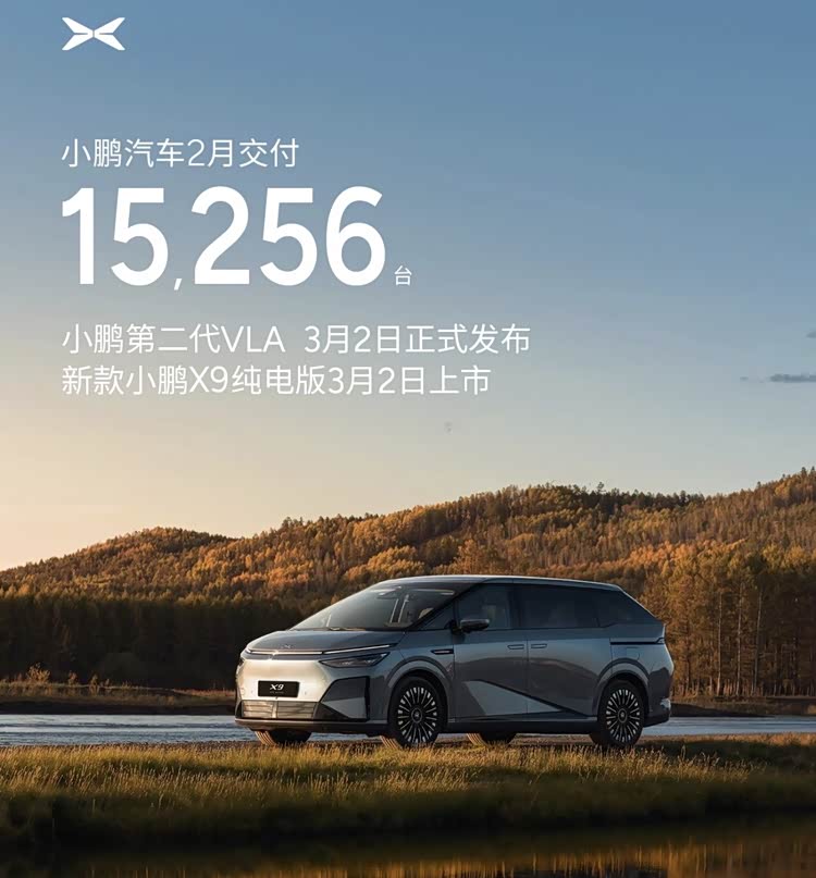 小鹏汽车2月交付新车掉落至2万辆以下,共交付新车15245辆,环比1月下滑23.7%,同比下滑约50%。1-2月份,小鹏汽车累计交付35267辆。按照规划,小鹏汽车2026年全年销量目标设定在55万至60万辆之间。3月2日,2026款小鹏X9纯电版将正式迎来上市。