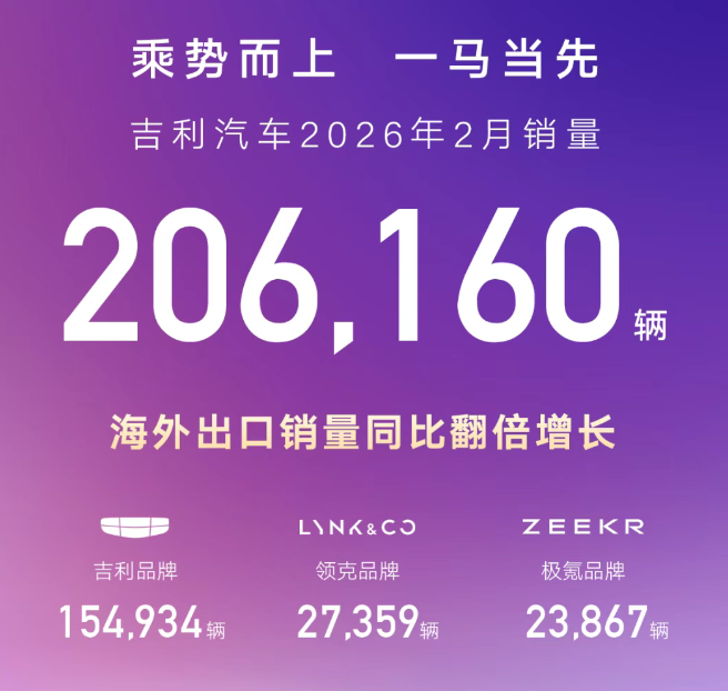 当然,也有表现很不错的方面,2月集团出口124929辆,同比增长41.5%;同时,截至2月份,奇瑞集团累计销量达到1889辆,其中,海外出口超609万辆,成为首个出口超600万辆的中国车企。长城汽车,2月销量72594辆,同比去年同期77,883辆下滑6.79%,环比1月销量90,312辆下滑19.6%。2月份海外销量同比大增37.36%。