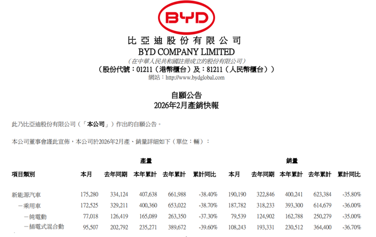 其中,2月份吉利品牌销量154934辆;领克品牌销量27359辆;极氪品牌23867辆,吉利银河品牌销量73125辆。2月海外出口60879辆,同比增长138%。比亚迪汽车,2月销量190,190辆,同比去年同期322,846辆下滑41%,环比1月份210,051辆下滑9%,比亚迪汽车出现环比同比全部下滑,值得行业关注!