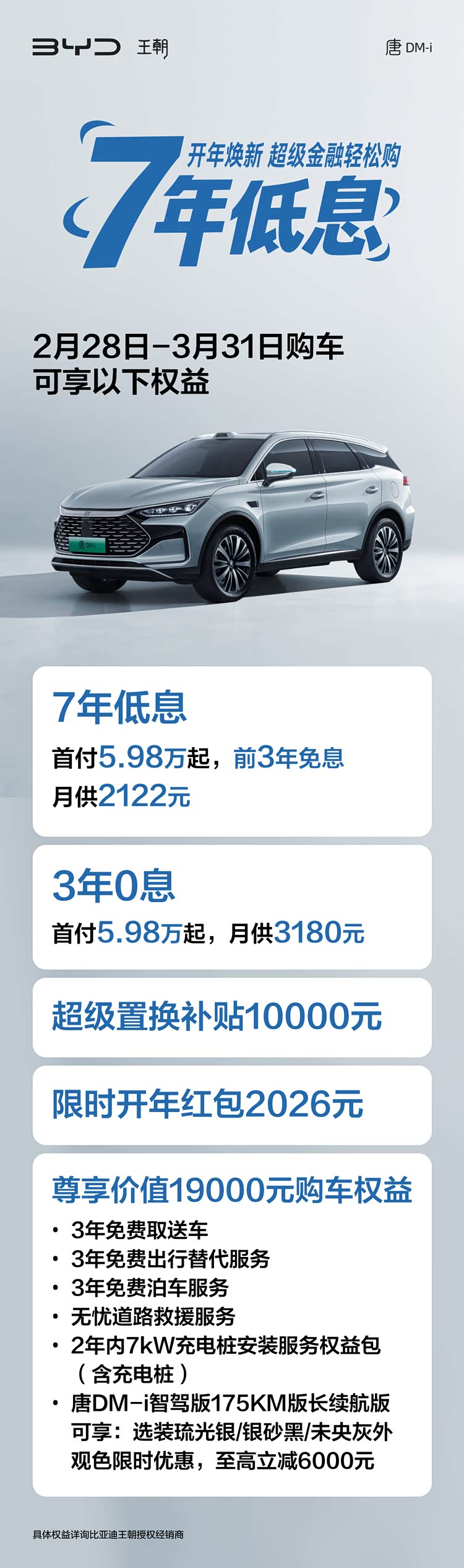 马年启新程,正是为家人升级出行品质的最佳时机。比亚迪王朝网重磅开启“开年焕新选王朝 超级金融轻松购”限时钜惠,为超890万用户量身打造诚意满满的购车方案。在王朝网六大IP中,唐家族专为家庭用户而来,此次唐DM-i智驾版携重磅权益而来,7年低息、3年0息、超级置换补贴、限时开年红包配齐,首付5.98万起,助力家庭轻松入手!