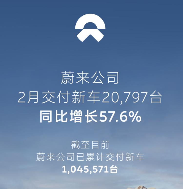 蔚来汽车2月交付量达20,797辆。与1月的27,182辆相比,虽环比减少了6,385辆,但依旧守住了2万大关;与2025年同期的13,192辆相比,同比增长57.6%,增幅超过五成,说明这份成绩单还是具备一定的含金量。