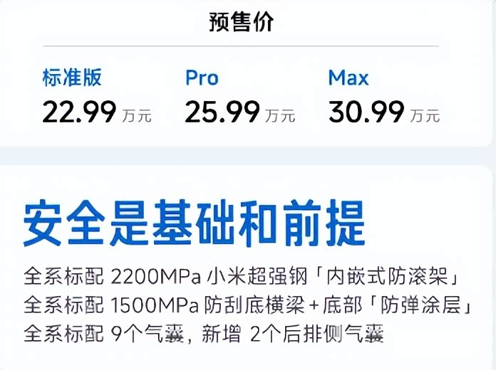 从现有官方信息来看,新一代小米SU7不仅带来了新颜色、新轮毂,更是升级了安全,在门把手内部增加机械应急结构,积极响应最新国标要求。更重磅的是,新一代小米SU7全系标配了2200MPa的小米超强钢“内嵌式防滚架”,安全维度确实加码了,但整备质量也增加了不少,比如标准版2055kg,相比现款入门版增加了75kg。