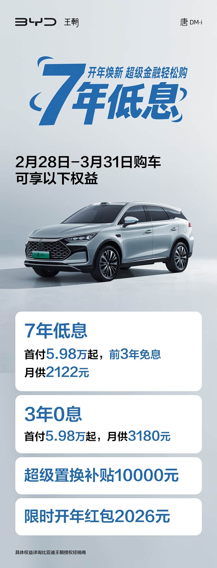 马年启新程,正是为家人升级出行品质的最佳时机。比亚迪王朝网重磅开启“开年焕新选王朝 超级金融轻松购”限时钜惠,为超890万用户量身打造诚意满满的购车方案。在王朝网六大IP中,唐家族专为家庭用户而来,此次唐DM-i智驾版携重磅权益而来,7年低息、3年0息、超级置换补贴、限时开年红包配齐,首付5.98万起,助力家庭轻松入手!