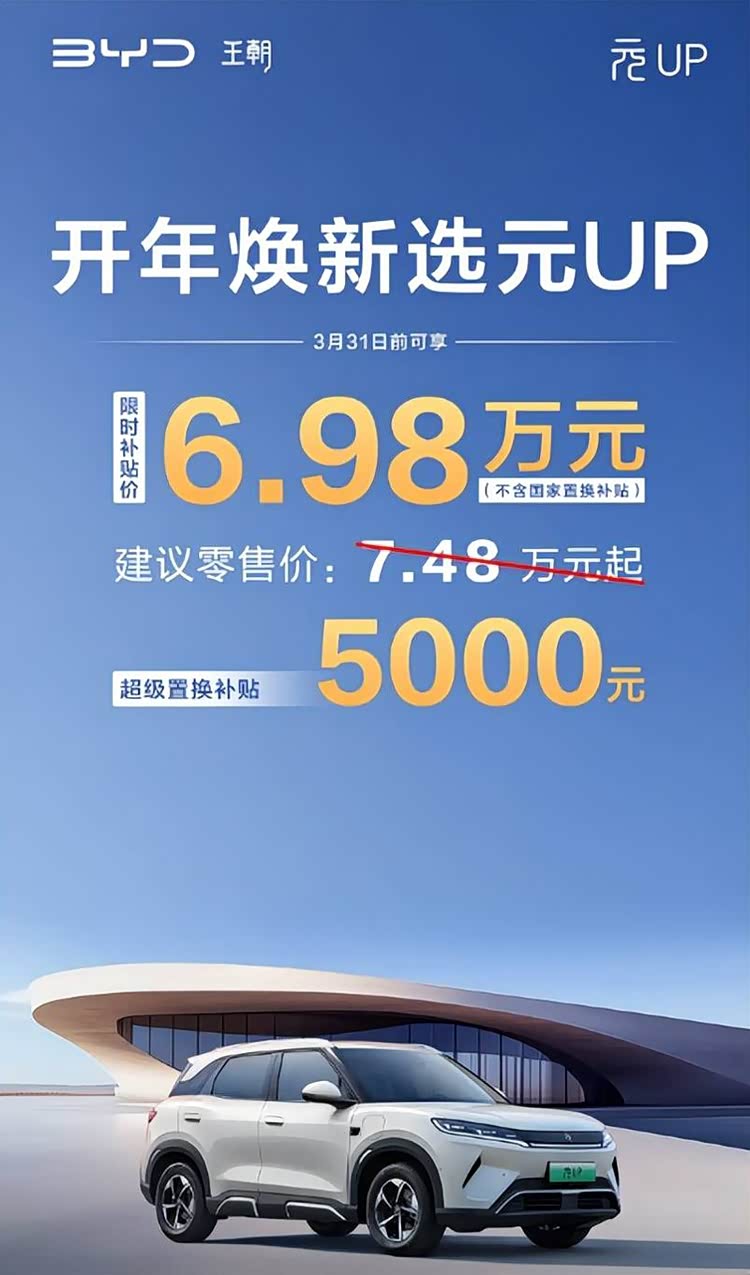 车市竞争始终是存在的,车企的促销政策也在力度上逐渐加码,实惠给到广大消费者,2026农历新年刚过,国内新能源领军车企比亚迪王朝网正式开启“王朝超级购车节”活动,即日起至3月31日购买 元UP(参数|询价)即可享受5000元厂家置换补贴,补贴后起售价6.98万元。