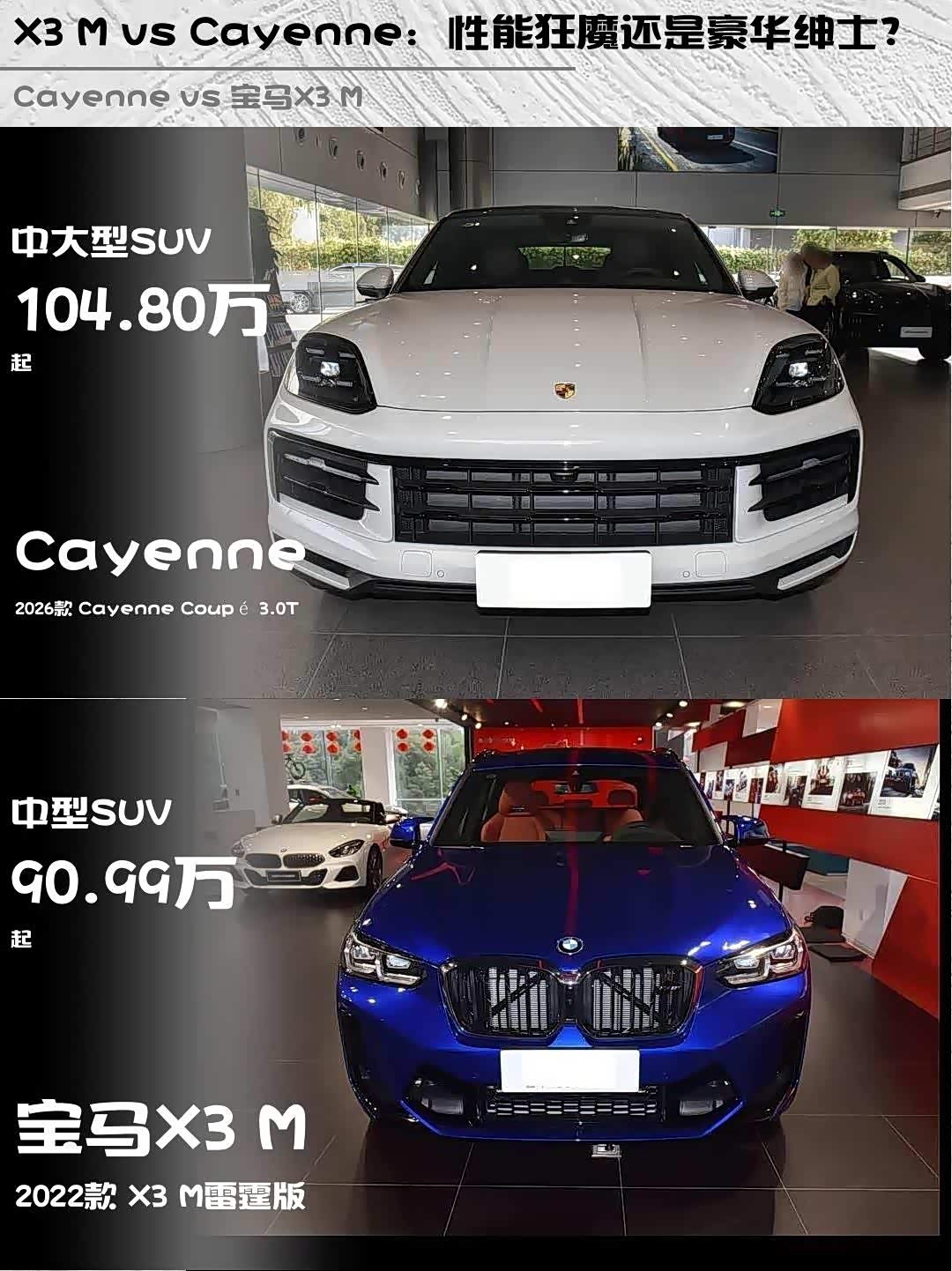 最近深度体验了两台性能猛兽——2026款保时捷Cayenne Coupé 3.0T和2022款 宝马X3 M(参数|询价)雷霆版,百万级性能SUV的对决真的让人纠结到爆!🔥