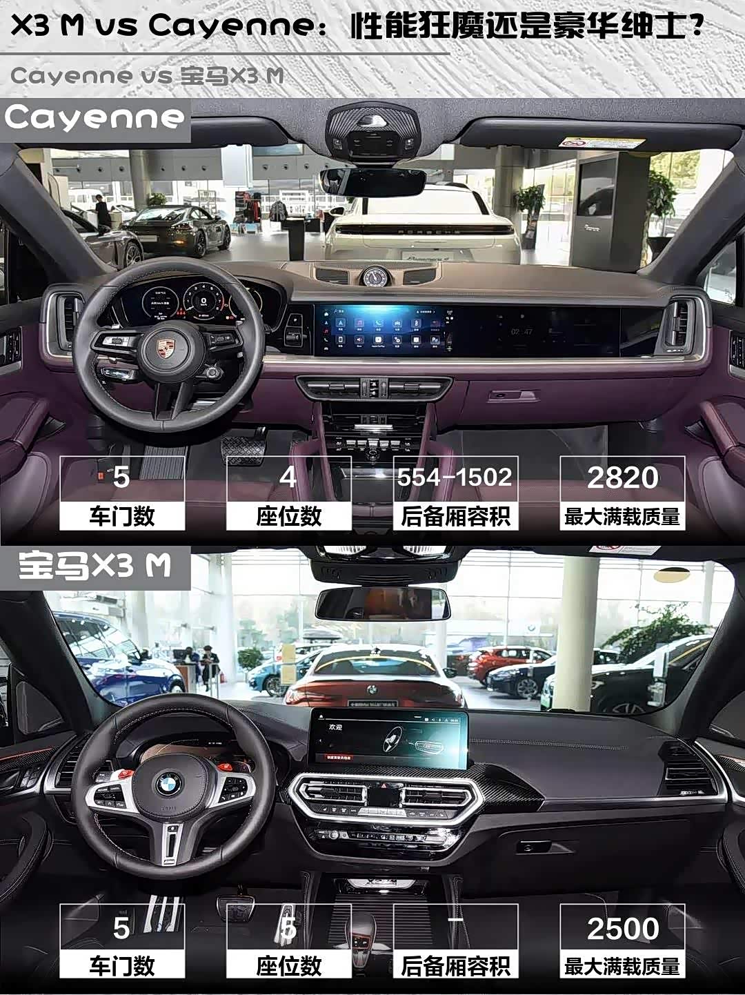 要纯粹的性能快感选X3 M雷霆版,S58机皇+8AT的组合堪称完美。但如果你想要豪华感与性能兼备,Cayenne Coupé的保时捷标+精装修内饰确实更香。不过提醒下,保时捷不选装的话配置真的很素,随随便便选个十几万很正常...