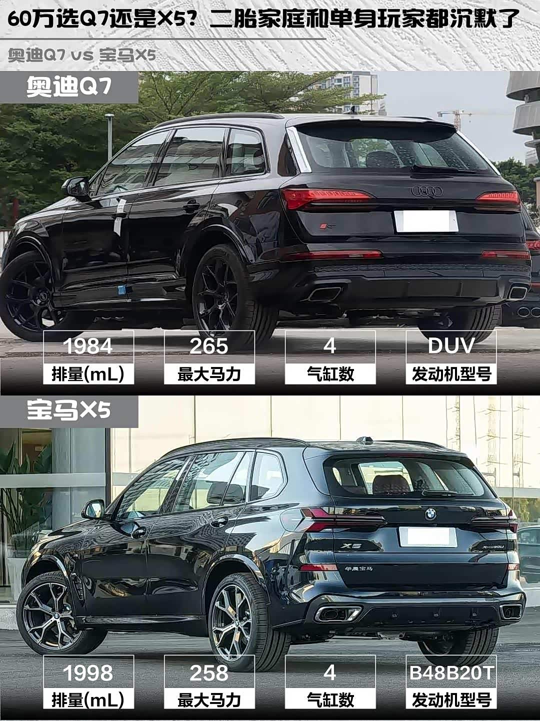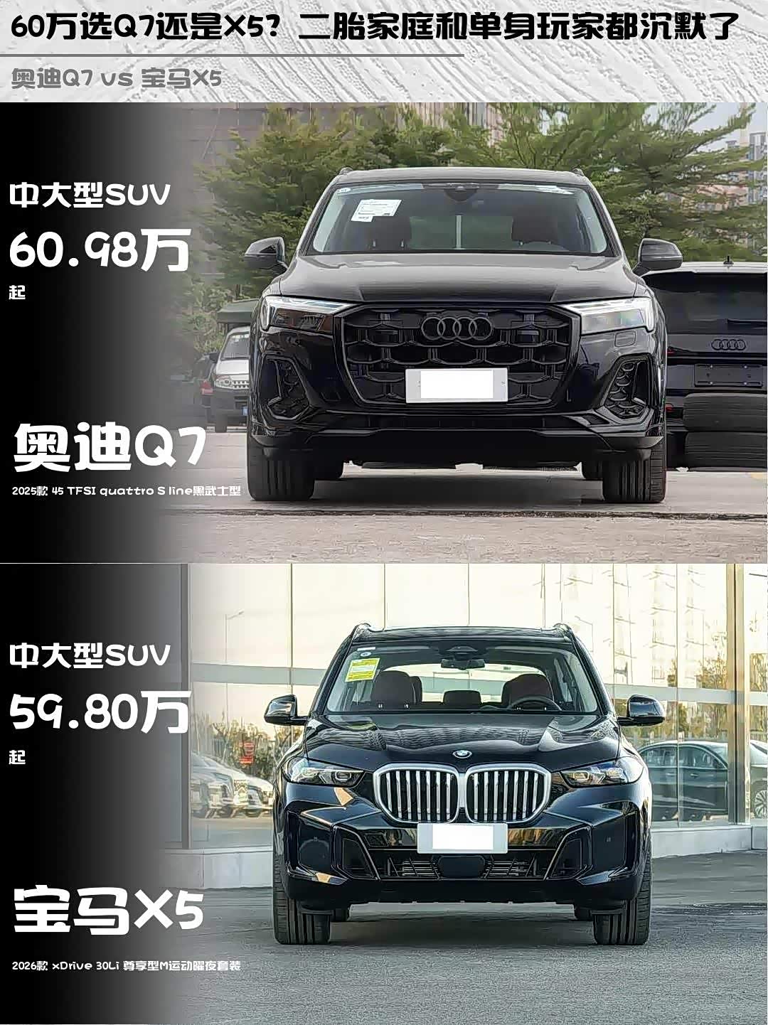 奥迪Q7(参数|询价) 2025款 45 TFSI quattro S line黑武士型 vs 宝马X5 2026款 xDrive 30Li 尊享型M运动曜夜套装,这两台60万级豪华SUV到底怎么选?看完这篇对比你就懂了!🔥