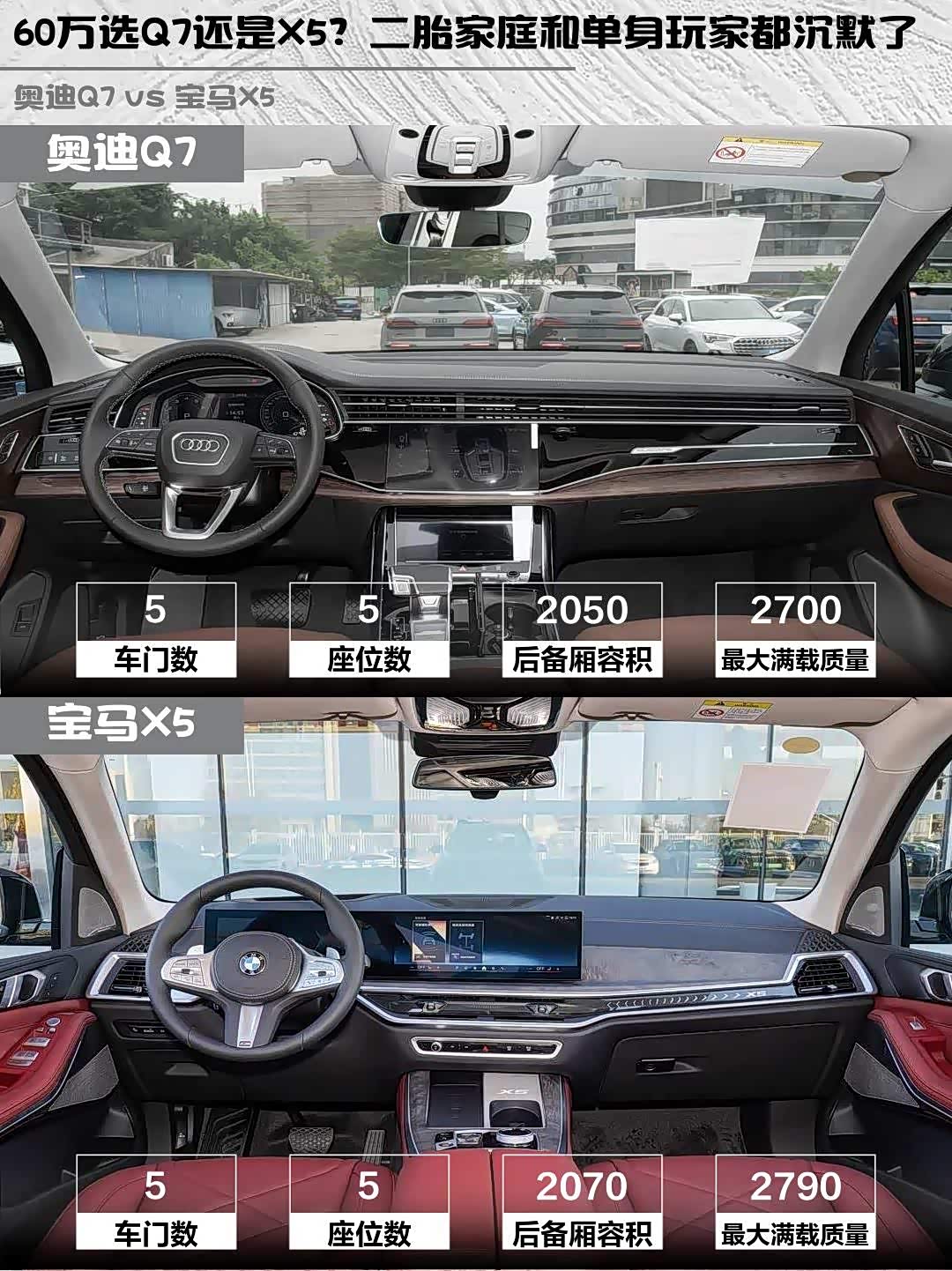 空间才是重头戏!Q7的2050L后备箱+可选7座,二胎家庭狂喜👨👩👧👦 二排座椅还能前后滑动9cm。X5轴距虽然加长130mm,但五座布局固定,后备箱2070L略大但扩展性不如Q7。不过X5后排地台几乎全平,中间乘客腿更舒服。