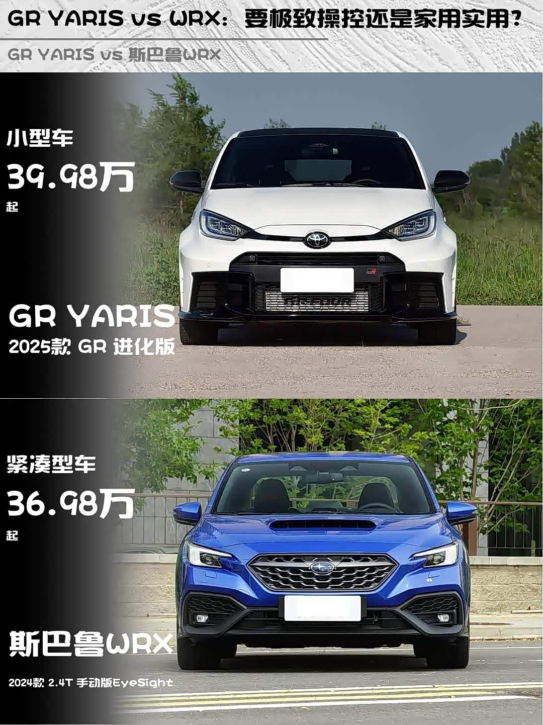 车家号·0浏览·2026-03-02 08:55 · 北京最近在纠结 GR YARIS(参数|询价) 2025款 GR 进化版和斯巴鲁WRX 2024款 2.4T 手动版EyeSight的朋友看过来!这两台手动挡性能车到底怎么选?实测干货分享👇
