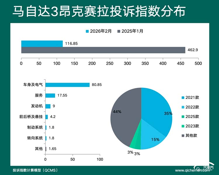 汽车质量投诉点评:马自达3昂克赛拉是本月投诉榜单中投诉指数下滑幅度最大的车型,降幅达74.76%,其中除受春节假期影响外,根据长安马自达官方人员回应,车主集中投诉的膨胀阀垫片生锈问题将会得到免费更换,这样促使马自达3昂克赛拉投诉指数出现大幅下滑。过保车型质量问题仍能得到免费解决,足以看出长安马自达对产品口碑十分重视。