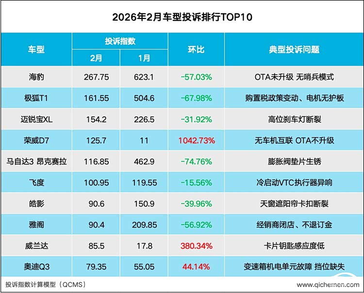 近日,汽车门网发布2026年2月车型投诉指数榜单,受春节假期影响,本月榜单中车型投诉指数多数出现大幅下滑,且下滑幅度在50%以上居多。其中比亚迪 海豹(参数|询价)因基数较高仍居首位,哨兵模式已然成为待解的难题。极狐T1和马自达3昂克赛拉的焦点投诉问题官方已给出解决方案,在春节假期的加持下投诉指数下滑明显。相比之下,荣威D7因车机迟迟不升级手机互联功能遭遇集中投诉,成为本月投诉榜单中最大的黑马。