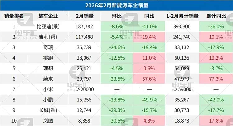 3月1日,主流新能源车企先后交出销量成绩单。2月份以来,虽然各大汽车厂商推出低息金融优惠措施,但受节假日影响,销量环比均有下滑。比亚迪以18.8万辆位列第一,吉利、奇瑞分列二三,小米下滑至第七名,小鹏销量降至1.5万辆,新势力分化进一步加剧。