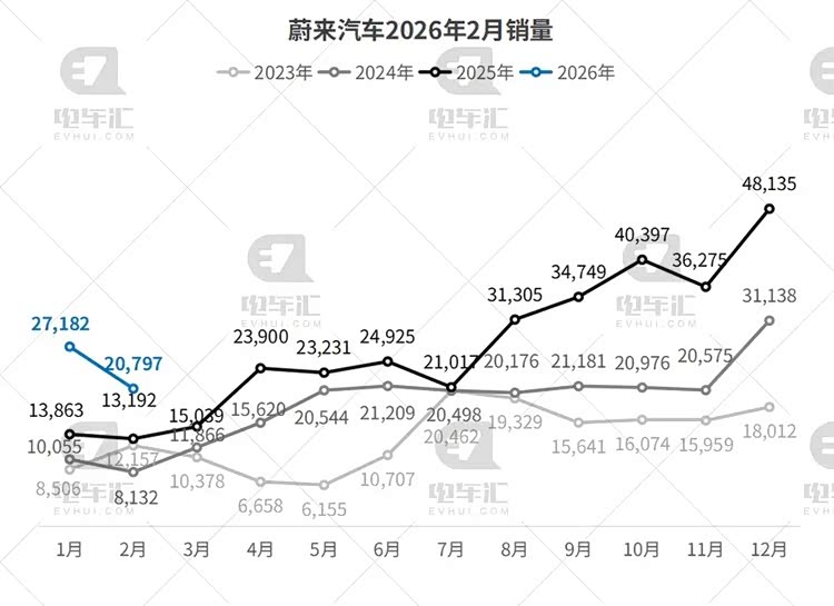 蔚来汽车2月交付20,797辆,环比下降23.5%,同比增长57.6%;1-2月累计销量47,979辆,同比大增77.3%。截止2月6日22:33:18,蔚来1亿次换电达成。