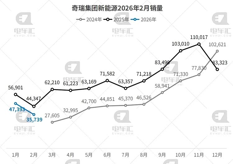 奇瑞新能源2月销量35,739辆,环比下降24.6%,同比下降19.4%。奇瑞集团累计出口量达600万辆,成为首个达到该数字的中国品牌车企。