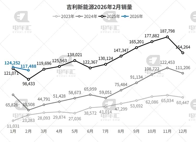 吉利2月新能源乘用车销量117,488辆,环比下降5.4%,但同比大增19.7%;1-2月累计销量241,740辆,同比增长10.1%。