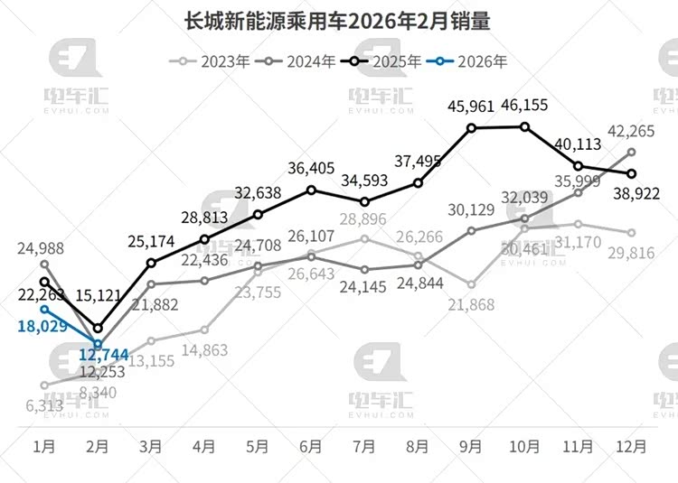 长城2月新能源乘用车销量12,744辆,环比下降29.3%,同比下滑15.7%。长城汽车海外销量劲增37.36%。