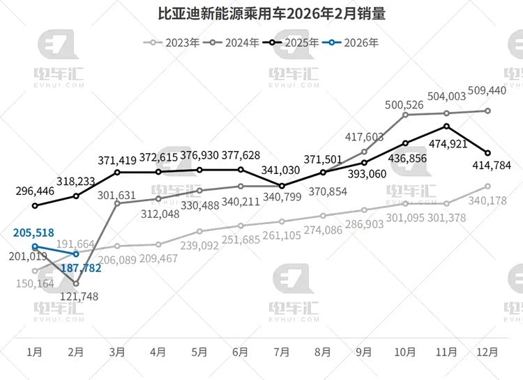 比亚迪2月新能源乘用车销量187,782辆,环比下降8.6%,同比下降41%,其中纯电车型销量79,539辆,占比42%,插电式混合动力车型销量108,243辆,占比58%。按品牌来看,王朝与海洋2月销量165,013辆、方程豹17,036辆、腾势5,501辆、仰望232辆。其海外销量明显,乘用车及皮卡海外销售100,151辆,同比增长41.4%。
