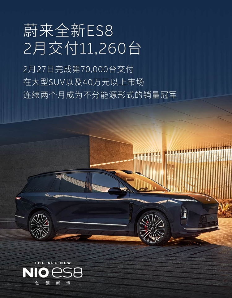 具体到单一车型,全新ES8在2月的表现比较突出。该月,这款车型完成了11260台的交付量。实际上,就在2月27日,一台全新的 ES8(参数|询价)在温州被交付到用户手中,这是该车型自上市以来下线的第70000台车。从第一台到第七万台,全新ES8实现这个交付量用了大约160天。一款定价在该区间的车型,能在数月内达成这一交付规模,反映了其在对应市场中获得了一定的接受度。