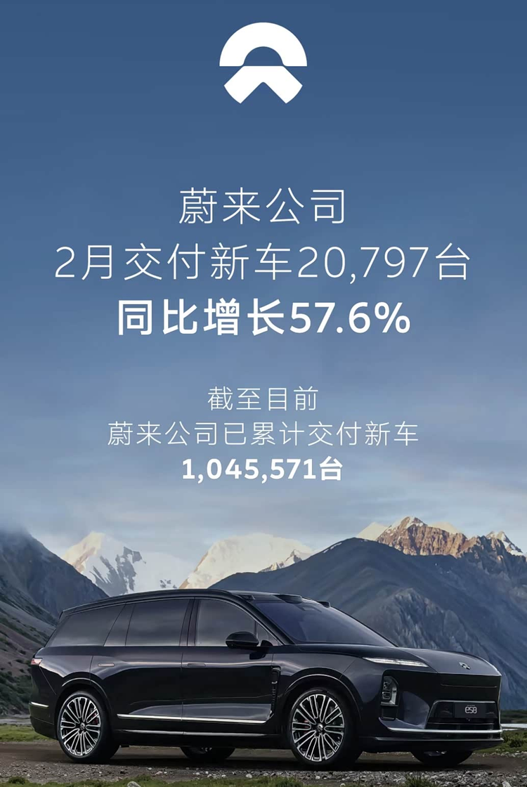 蔚来在3月1日公布了其上个月的交付成绩。数据显示,整个2月,该公司共向用户交付了20797台新车。与去年同期相比,这个数字的增长幅度达到了57.6%。在整体交付量提升的同时,蔚来旗下产品的累计交付规模也跨过了一个门槛。截至2月底,蔚来品牌自成立以来,已经累计交付了1045571台汽车。此外,其面向家庭市场的子品牌乐道,累计交付量也达到了135031台。