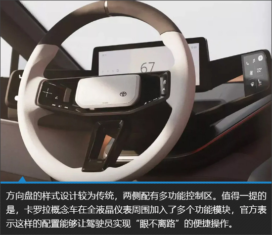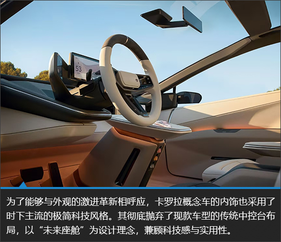 内饰部分,卡罗拉概念车以极简科技为核心导向,打破传统座舱布局,兼顾视觉质感与实际使用需求。设计方面大胆融合复古与未来元素,材质选择符合环保理念,空间布局优化也完美贴合了家用属性。简单来说,其展现出的“科技不繁琐、实用不廉价”的标签,确实非常符合丰田的一贯作风。