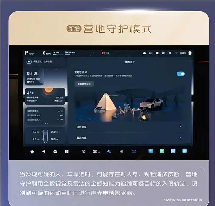春节假期,不少车主选择带着家人去郊外露营过年。OS 1.1.0新增的“营地守护模式”,成了最实用的功能之一。开启该模式后,车辆利用全像视觉及雷达技术实现360度全感知监测,能够精准追踪可疑目标的入侵轨迹。车主可以自由设定安全范围和警示方式——从闪灯到鸣笛,分阶段自定义。