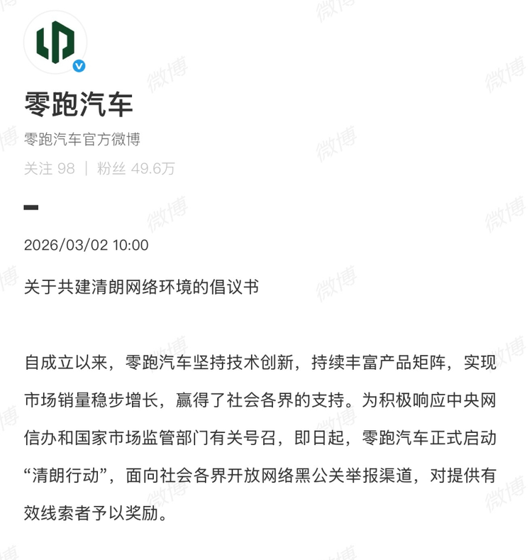 零跑汽车启动“清朗行动”:悬赏最高500万元征集黑公关线索