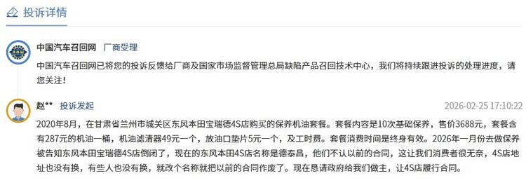 在中国汽车召回网上有用户投诉,“2020年买的10次保养套餐,用了不到一半,4S店突然就倒闭了。”甘肃兰州的赵先生至今仍感到愤怒。他曾在当地东风本田宝瑞德4S店花费3688元购买了一份“终身有效”的基础保养套餐,然而2026年1月,当他再次前往保养时,却发现店面已改头换面,新接手的德泰昌4S店以“不是我们卖的”为由,拒绝履行原合同。