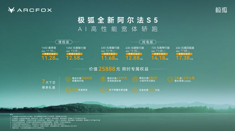 全新阿尔法S5定位AI高性能宽体轿跑,以最美轿跑的颜值、11万级同级领先城区NOA、纯电720公里/增程1450公里同级领先超长续航、“满电馈电都是一条龙”的增程技术、开得猛刹得稳的操控性能以及智能声光电全域4D座舱,率先打响2026年轿车市场价值升级之战。