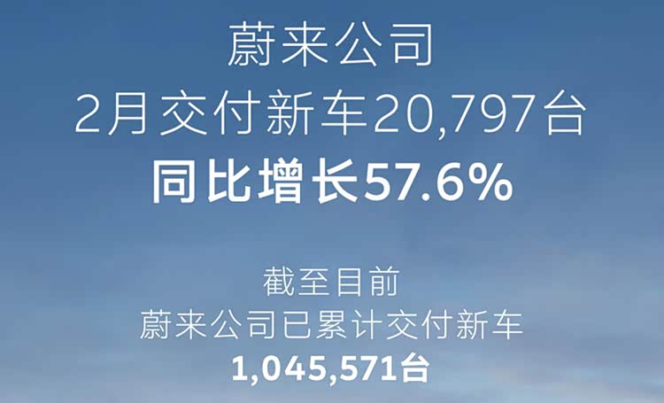 3月1日,蔚来汽车官方宣布,2026年2月销量20797台,同比增长57.6%。