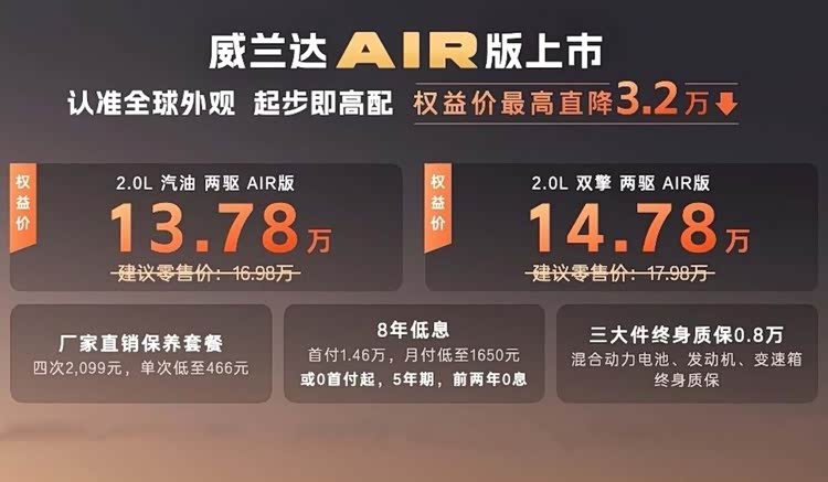 在去年完成了换代之后,威兰达以超11万台的年销数据收官。客观来说,此次换代并没能帮它止住同比下滑的势头,那这次的门槛下调优惠说不定可以。AIR版所实现的权益价,比此前的官价低了3.2万元,加上厂家直销的保养套餐等,购车与养车的成本压力都会降低不少。当然了,车辆本身通过无框格栅、C型大灯等设计带来的电感,也跟上了当下的流行趋势,而完善的底盘运动包围,也带给了它同级车不具备的视觉硬度。