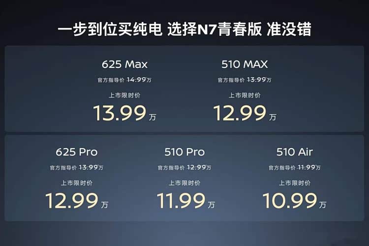 日产N7青春版作为现款车型更新版本,其实际就是对价格进行了一定调整,并在售后与质保政策等方面给出了一些权益,上市限时价对比官价有了1万元的下调。应该说日产N7本身是有较高性价比的,在保持前后三段式光环与流畅溜背车身来提升颜值的情况下,现在10万级就能入手C级纯电车,确实蛮有吸引力的。