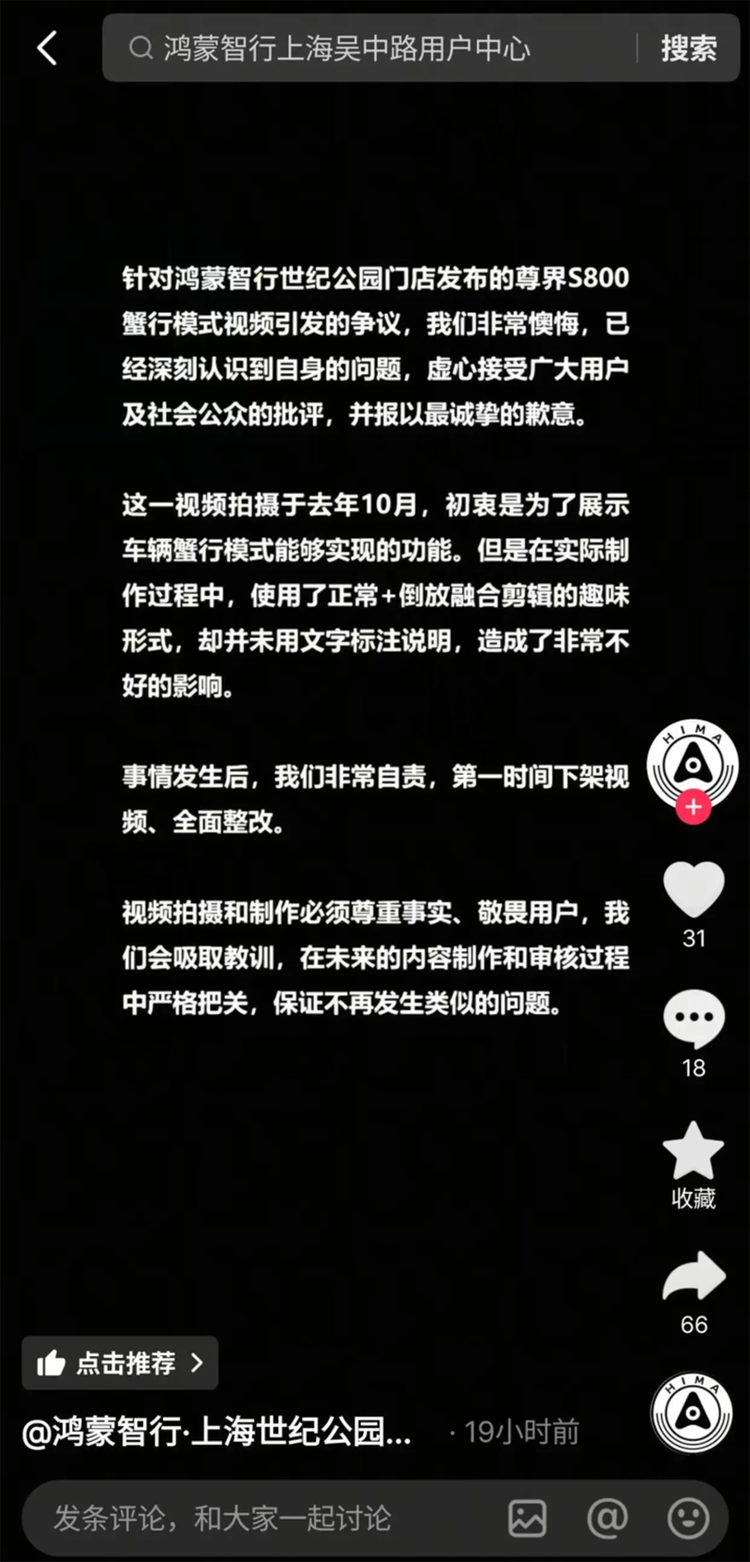 现在有准确答案了,因为鸿蒙智行处罚了违规营销门店,分别为“鸿蒙智行·上海世纪公园用户中心”和“鸿蒙智行·上海吴中路用户中心。”两家门店在某视频应用中发布了道歉声明,就使用加速、倒放视频素材用于营销的行为表示认可;鸿蒙智行方面将对涉事门店处以扣除绩效分、限期整改和要求经销商对负责人进行经济处罚和问责等处罚,并要求鸿蒙智行全体门店引以为戒,严格遵守品牌规定和法律法规,诚信合规经营。