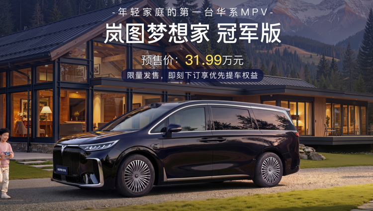 岚图梦想家冠军版目前是预售状态,预售价格是31.99万元。作为纪念梦想家 20万辆整车下线推出的新车,新车并非简单贴标限量款,而是在现款基础上做了大幅度的升级。