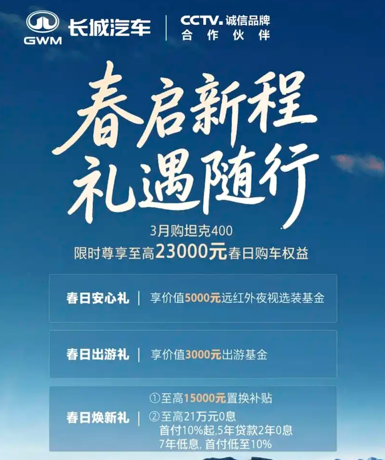 坦克品牌全系都有动作。 坦克300(参数|询价)全品牌置换补贴1.5万元;坦克400至高2.3万元春日权益;坦克500至高2.4万元;坦克700综合补贴能到3万元。另外还有7年低息或5年贷款前2年0息的金融政策。