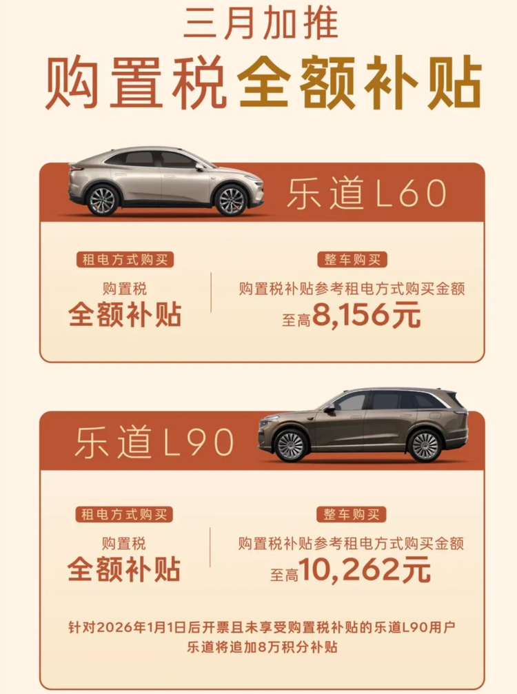 乐道这边除了7年超低息金融方案,还加推了购置税全兜底,全系至高补贴10262元。L60首付2.99万元起,日供69元;L90首付3.59万元起,日供89元。