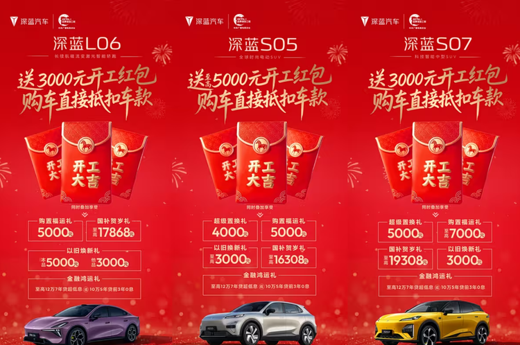深蓝汽车则给L06、S05、S07三款车准备了至高5000元开工红包和以旧换新补贴,金融方面有12万7年贷款低息或10万5年贷款前3年0息方案。