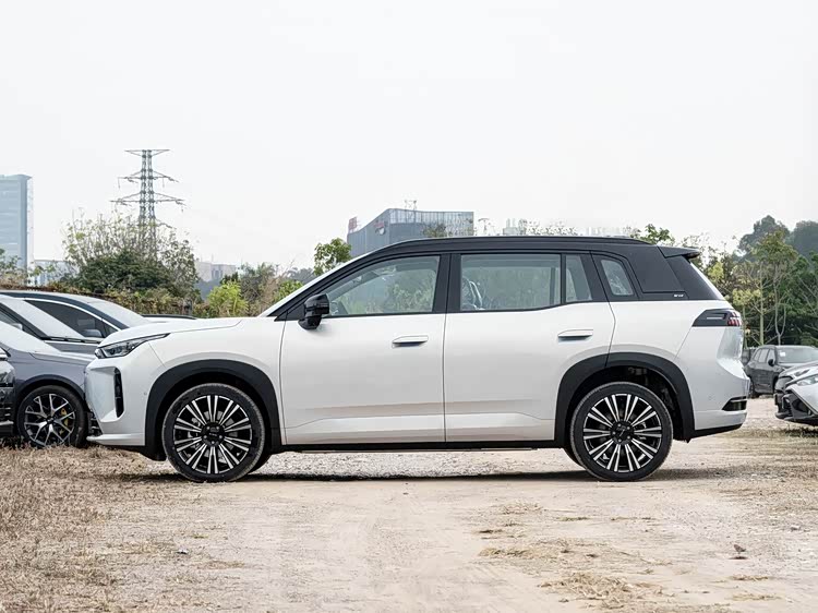 再来看车身侧面部分,4685mm的车长搭配2775mm的轴距,营造出紧凑却不失大气的车身比例。流畅自然的线条勾勒出方正稳重的造型,半隐藏式门把手巧妙融入车身,既提升了整体美感,又能有效降低风阻^。车窗处的黑化处理营造出悬浮式车顶的视觉效果,搭配19英寸多辐轮毂,动感十足,黑色轮眉则凸显了SUV的硬朗气质。